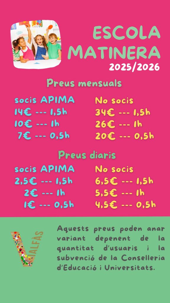 Així mateix, a l’inici de curs l’APIMA convoca una reunió per saber quines famílies faran ús del servei. Després es divideix el preu que costa la monitora entre tots els usuaris. Per això, el preu final depèn dels usuaris que hi ha cada mes i de la possible subvenció que es rep de la Conselleria d’Educació i Universitat.